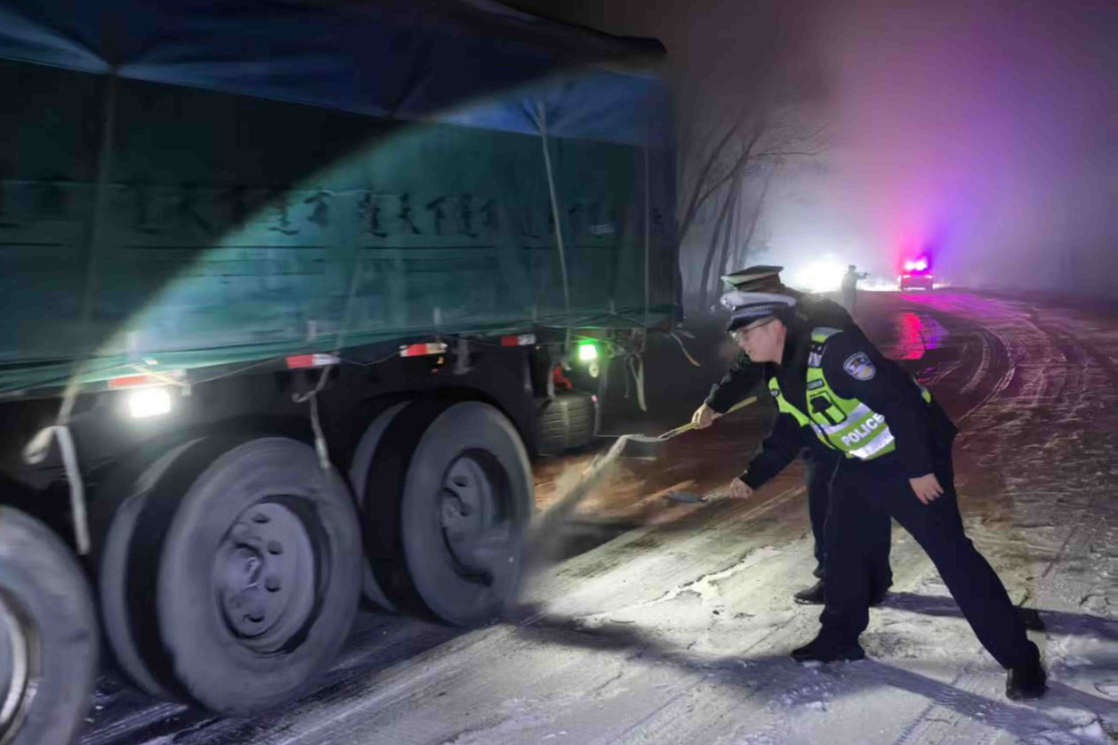 五大连池市公安局反恐与交巡特警大队开展路面防滑处置 筑牢交通安全屏障
