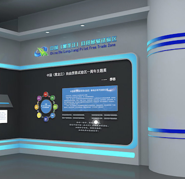 整个展厅紧紧围绕关于“推动东北全面振兴全方位振兴、建成向北开放重要窗口”的战略定位。2019年8月30日,中国(黑龙江)自由贸易试验区正式启动,其中黑河片区20平方公里、哈尔滨片区79.86平方公里、绥芬河片区19.99平方公里。在三个片区内,他们对标国际先进规则,持续优化营商环境,在自贸区政策支持下,大胆试、大胆闯、自主改,涌现出一批改革经验,打造出一批又一批优秀的制度创新案例。