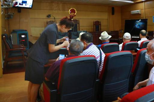 在解说员的引导下,老党员同志们饶有兴致地参观了加安检室、诉讼服务中心、文化长廊、科技法庭等场所,亲身了解人民法院的日常工作。