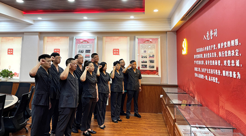 在签到点名、缴纳当月党费后,支部书记郑海国带领全体党员重温入党誓词。党员们紧握右拳,庄严肃立,面对鲜红的党旗立下铮铮誓言,用响亮的宣誓声表达了对党的无限忠诚和为党的事业奋斗终生的决心。