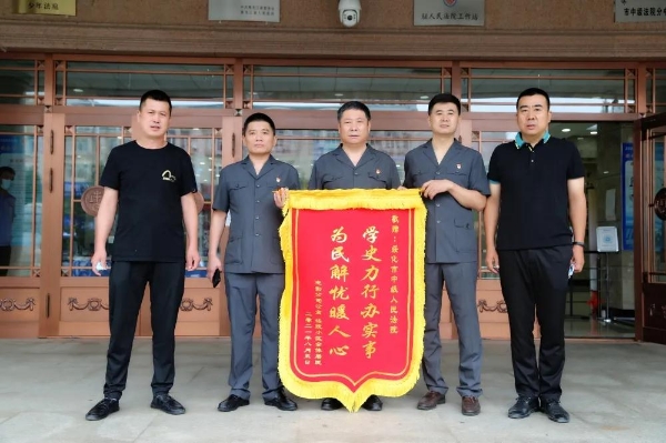 8月5日上午,绥化电影公司公寓和市法院家属楼小区居民代表苏月军将一面印有“学史力行办实事,为民解忧暖人心”的锦旗,交到绥化市中级人民法院机关第二党支部书记、司法行政装备管理科科长陈刚等人手中,感谢绥化市中级人民法院帮助老旧小区170户居民协调解决“吃水难”问题。