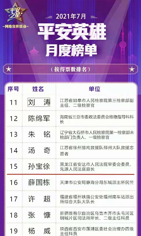 黑龙江经济网讯(孙瑛 张多 记者马朝林)8月31日,中央政法委放出“平安英雄”月度榜单,经过一个月紧锣密鼓的投票,全国各地踊跃参与,2021年7月100名“平安英雄”终于脱颖而出。其中,安达市人民法院审委会委员、先源法庭庭长孙宝徐以突出的事迹成功入榜。