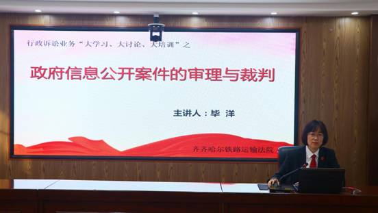 黑龙江经济网讯(马占元)为贯彻落实行政诉讼业务“大学习、大讨论、大培训”的活动要求,10月9日下午,民事审判庭副庭长毕洋为大家作题为《政府信息公开案件之审理与裁判》的行政诉讼业务专题讲座,全体员额法官、法官助理、书记员参加讲座。