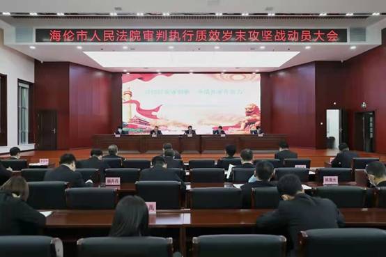 黑龙江经济网讯(孙瑛 尹文慧 记者马朝林)为确保全年各项审判执行质效目标任务高质量完成,11月3日,海伦市人民法院召开审判质效“岁末攻坚战”动员会,进一步学习传达全市法院审判执行质效会议精神,总结研究分析1-10月审判执行质效指标情况,并就下一步工作进行安排部署。院党组书记、院长马亮出席会议并讲话,党组成员、副院长韩秋主持会议,其他党组成员、各部门负责人及全体员额法官参会。