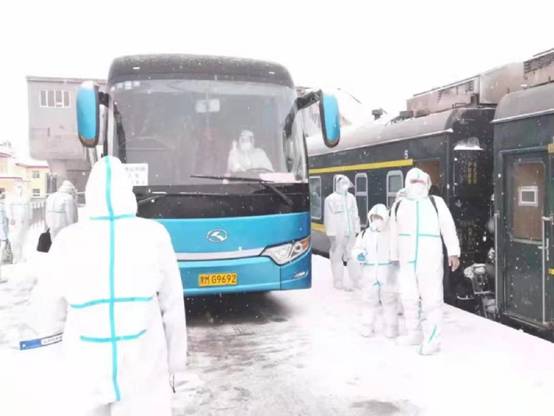 当日,“逆行小分队”从黑河到达绥棱的专列上转运391名隔离人员,因穿防护服不能如厕,队员们不敢喝水,不敢吃东西。一直到下午两点将隔离人员安全接回,才回到隔离宾馆吃上第一顿饭,虽然盒饭早已凉透,但是队员们心里是高兴的,因为他们顺利完成了第一次转运任务。