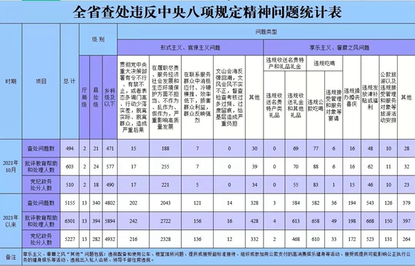 黑龙江经济网讯(记者姜国)记者从黑龙江省纪委监委获悉,2021年10月,全省各级纪检监察机关共查处违反中央八项规定精神问题494起,批评教育帮助和处理603人,其中党纪政务处分510人。
