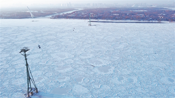 近日,松花江干流哈尔滨段封江,严冬的帷幕就此拉开。封江之前,伴随着冰凌汛,封江时大大小小的冰凌相互摩擦、碰撞,让冰凌竖立起来,形成“武封江”现象。相对于“文封江”时江面的光滑平整,“武封江”的江面冰凌高高低低,起伏连绵,难以看到平整的冰面。松花江干流封江时,一个个圆环状的冰凌凝固在江面,密密排列,宛如月球表面的“月球环”,这种冬季的奇特景象,十分少见。