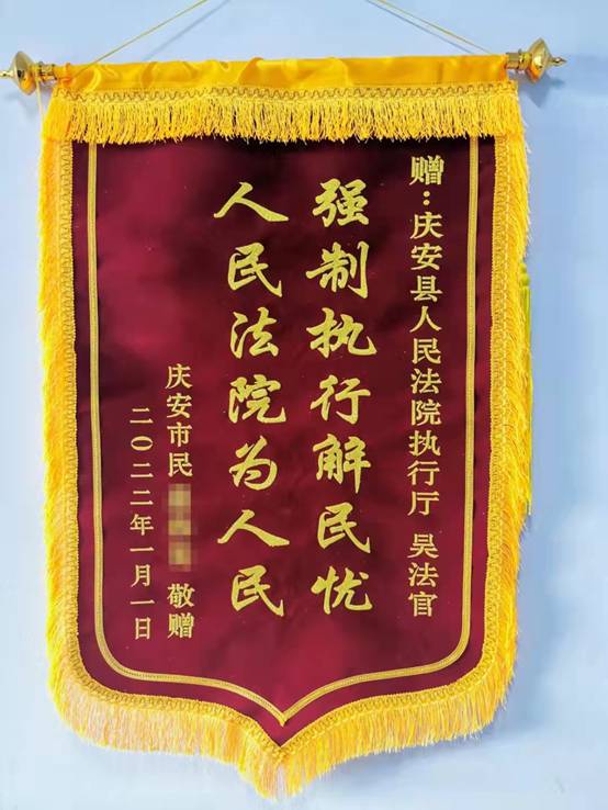 黑龙江经济网讯(王全友 管志刚 记者马朝林)新年伊始,东北的天气格外寒冷,但是庆安县人民法院执行干警的工作热情和执行干劲却越发高涨。近日,当事人又送来了一面锦旗,更增春意。