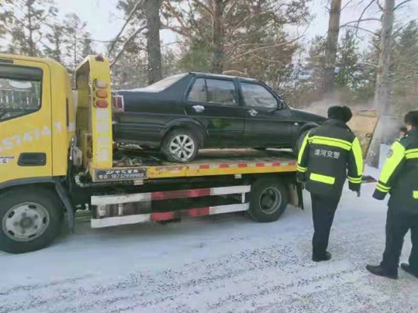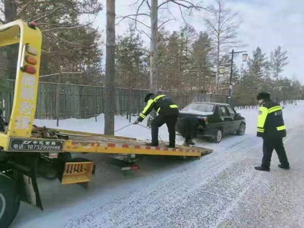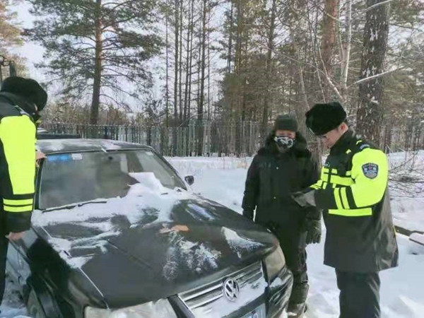 1月12日深夜,在零下38摄氏度的严寒天气下,整合后的北极镇交警中队民警驱车往返40余公里,成功解救两名在从龙江第一湾景区返回漠河途中,由于严寒气温导致轮胎胎压降低后脱圈,车辆无法挪动而受困的外地自驾游游客,帮助他们联系住宿宾馆,联系救援拖车将车辆拖回北极镇,并为二人购买了治疗冻伤的药品。受困游客白某佳与邹某云为民警送来了印有“感谢人民好交警,助人为乐新风尚”的锦旗。