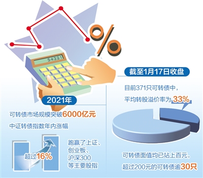 个券转股溢价率也在不断攀升。同花顺iFinD数据显示,截至1月17日收盘,目前371只可转债中,平均转股溢价率为33%;同时,可转债面值均已站上百元,超过200元的可转债逾30只。专家表示,当前市场流动性较为充沛,机构转债配置需求旺盛,支撑可转债市场景气度。同时,在资管新规背景下,银行理财加速净值化转型,部分理财资金进入转债市场,进一步推升个股溢价率。