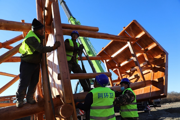阿木尔林业局职工正在安装萨布素景区大门(王力 摄)