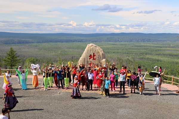 游客走进阿木尔林业局北极岛大型石刻网红打卡地,为找到北了而欢呼雀跃(王力 摄)