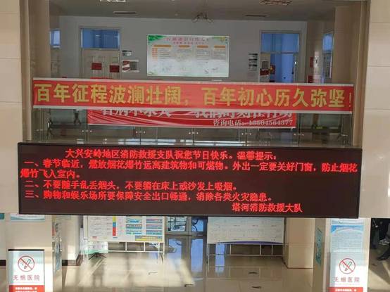 黑龙江经济网讯(石继传 记者马朝林)为做好春节期间消防安全保卫工作,进一步在辖区范围内奠定坚实的辖区消防安全基础,全力营造良好的消防安全舆论氛围,警示广大群众提高家庭防火意识,1月26日,塔河县消防救援大队积极组织辖区十八站医院、中央商厦、金色纯歌舞厅等重点单位开展消防宣传,积极协调单位利用LED液晶显示屏,全天候不间断滚动播放消防宣传提示语等相关信息,让来往群众利用上下班间隙或在商场休闲娱乐之余学到消防知识,从而提高社会面抵御火灾能力。