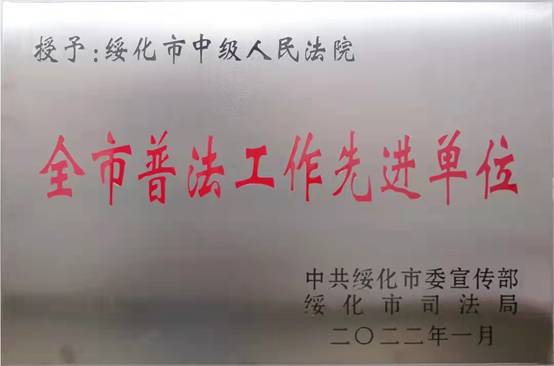 黑龙江经济网讯(孙瑛 王全友 记者马朝林)近日,中共绥化市委宣传部、绥化市司法局联合授予绥化市中级人民法院全市普法工作先进单位荣誉称号。