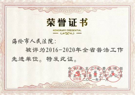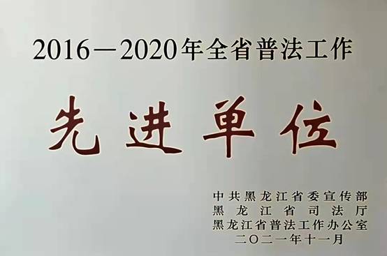 黑龙江经济网讯(王全友 尹文慧 记者马朝林)近日,黑龙江省委宣传部、黑龙江省司法厅、黑龙江省普法工作办公室联合授予海伦市人民法院2016-2020年全省普法工作先进单位。