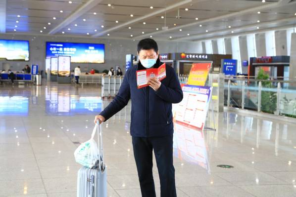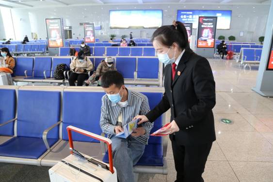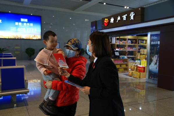 干警在火车站候车区设立远离非法校园贷款的宣传板,向候车学生及家长发放防范非法校园贷款的宣传单,讲解非法校园贷款的常见形式、危害及典型案例,提高学生警惕防范不良校园贷款意识、树立正确的消费观念,提醒大家遇到非法校园贷款事件时应及时报警维权、学会运用法律手段保护自身合法权益。同时,干警也向群众宣传了2022年1月1日正式实施的《中华人民共和国家庭教育促进法》的相关知识,引导大家“依法带娃”。