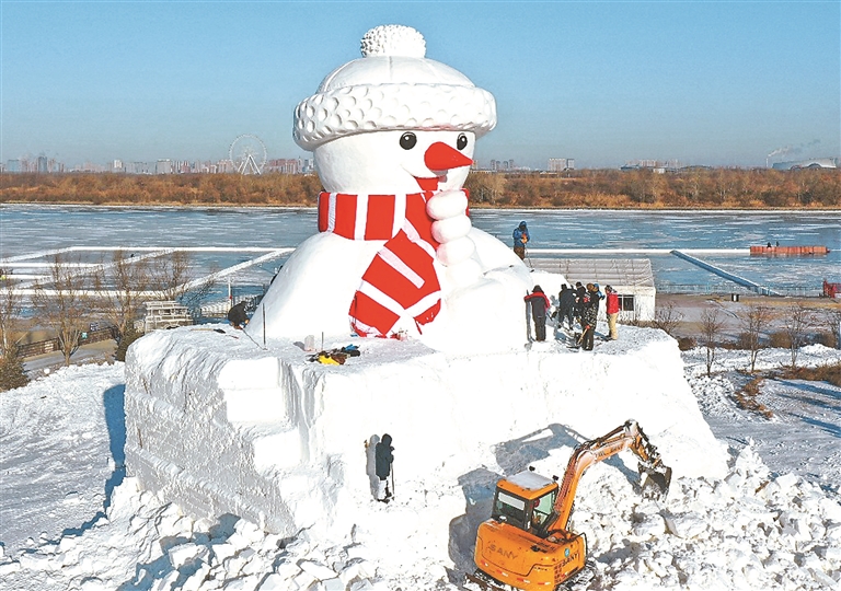 12月7日,哈尔滨市道里区群力江畔,一座巨型雪人已基本制做完成,工人在进行收尾工作。雪人近20米高,黑眼睛,红鼻子,戴着红围巾和白绒帽,手里拿着一大串糖葫芦,笑容可掬,十分可爱。