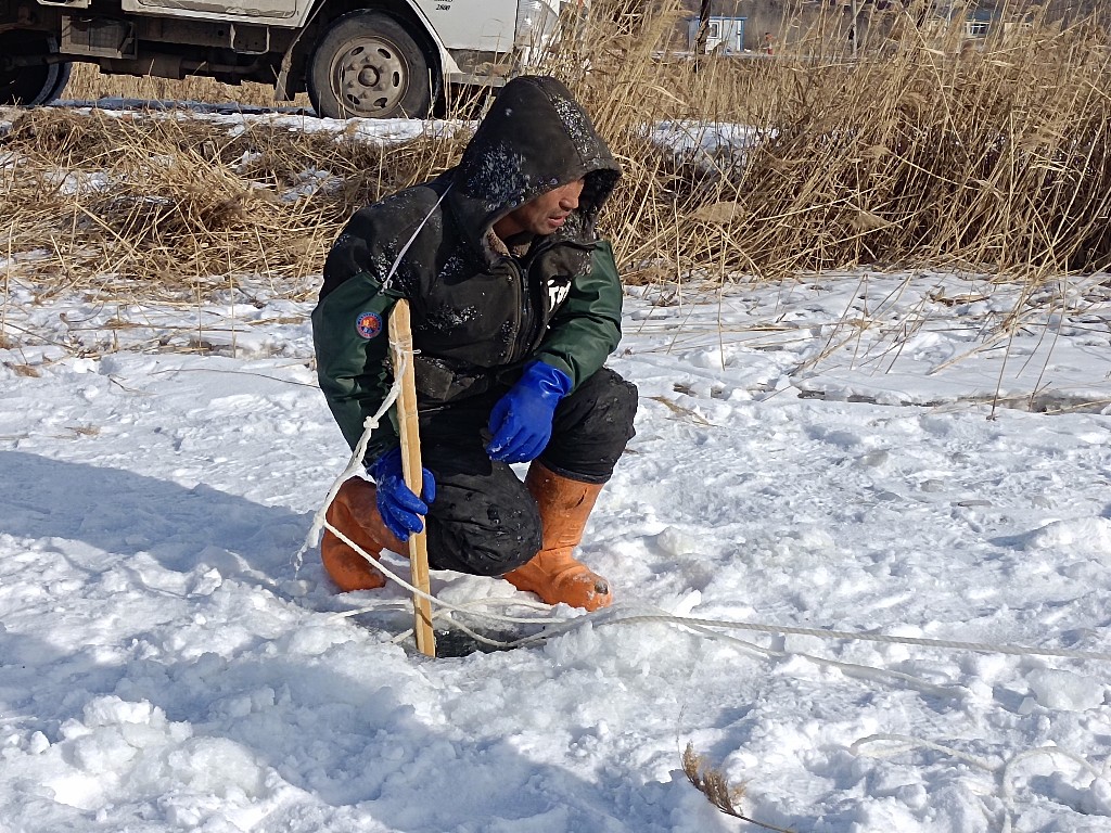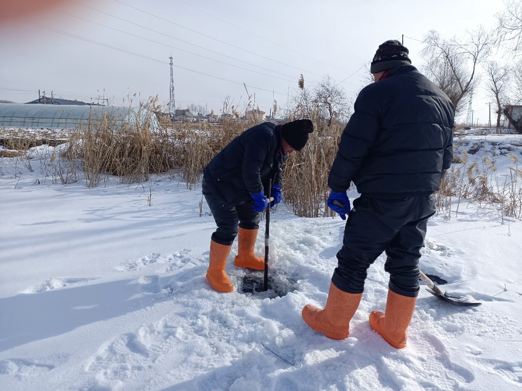 2023年2月19日上午,肇东市涝洲镇合居村村外的一处鱼塘,11名专业打冬网的壮汉正在凿冰钻眼,穿线布网。在15亩鱼塘捕获2万斤鱼是这一网的目标。