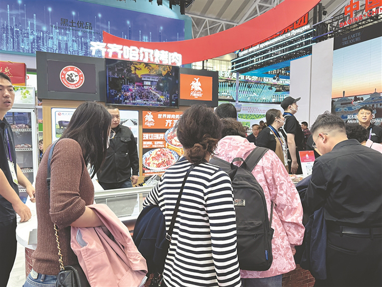 很多参观者慕名来到齐齐哈尔烤肉展位前。 本报记者 孙铭阳摄