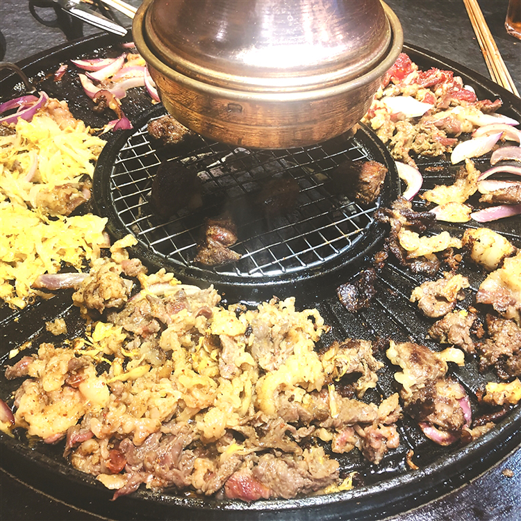 现场飘着烤肉香。