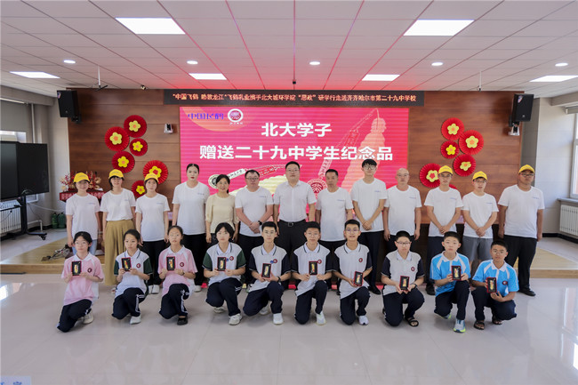 北大学子向齐市二十九中学生赠送纪念品并合影