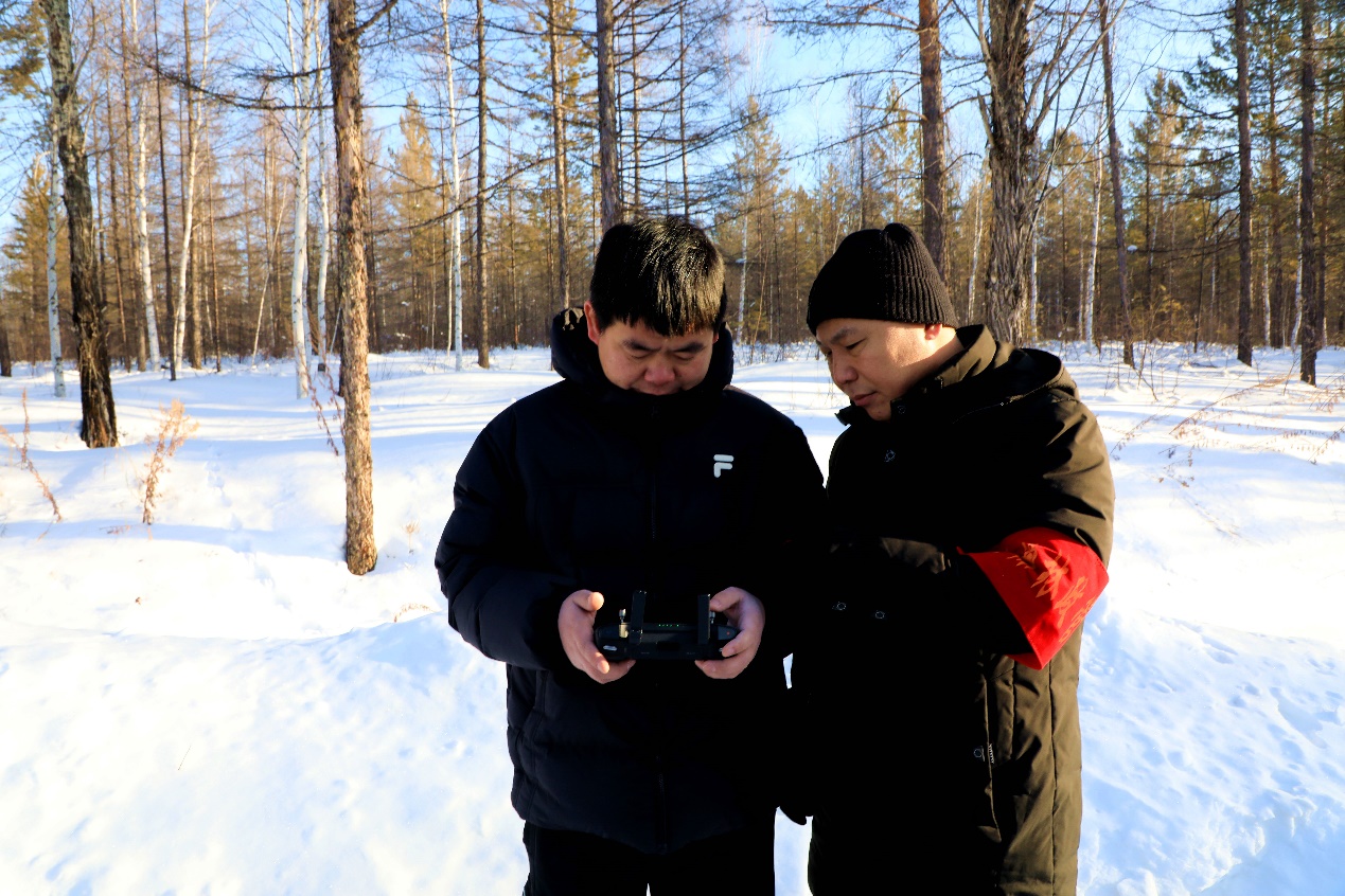 阿木尔林业局森林资源管理科工作人员利用无人机从空中查看林间是否有盗猎野生动物情况(王力 摄)