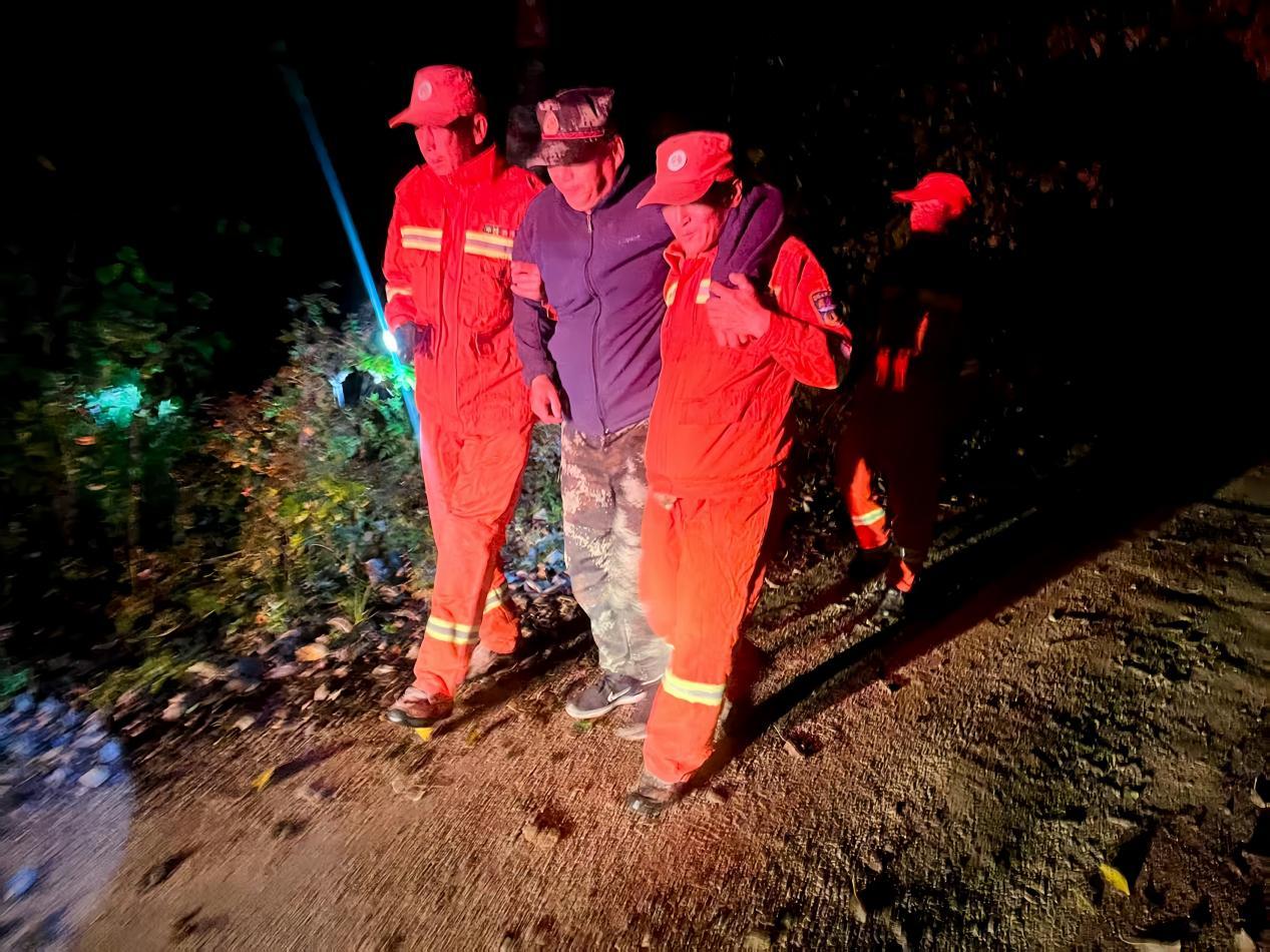 “张师傅!听到请回应!”的呼喊声在山林暴雨中回荡,显得格外急促。经不懈努力,当晚21时30分,救援队员在雨中听到了已出现失温症状的张师傅的微弱回应,并迅速成功施救,为他提供热水、食物和衣物,待其逐渐恢复体力后安全护送下山。