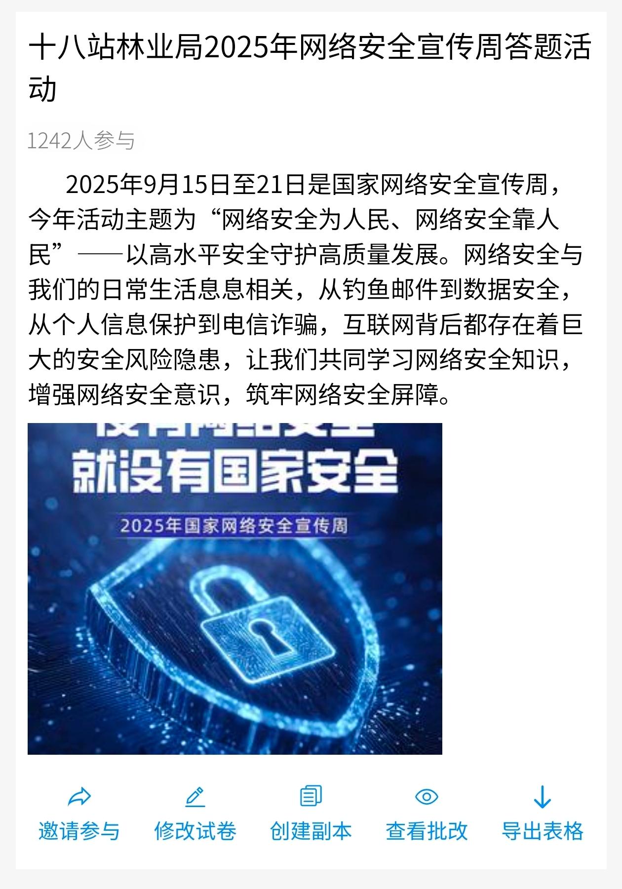 为进一步扩大宣传覆盖面,在公众号上推出“网络安全知识有奖答题”活动,涵盖了《网络安全法》《个人信息保护法》、密码安全、办公环境安全等多个方面,在互动中深化了对网络安全知识的理解与掌握,形成了线上线下协同推进的宣传合力。