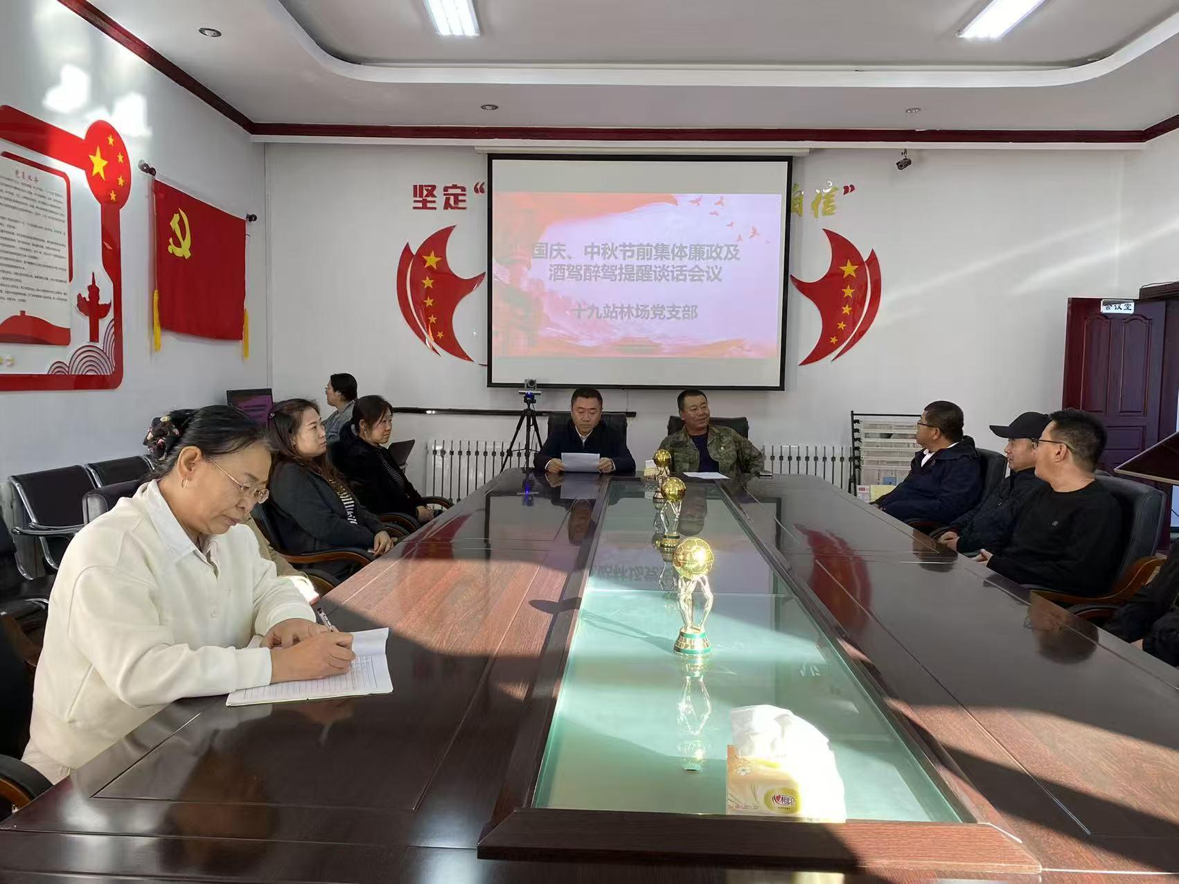 黑龙江经济网讯(王秀萍)国庆、中秋将至,为巩固拓展深入贯彻中央八项规定精神学习教育成果,进一步增强党员干部廉洁自律意识和拒腐防变能力,确保节俭文明廉洁过节,9月29日,十八站林业局十九站林场党支部召开国庆、中秋节前集体廉政提醒谈话会议,并对林场国庆假期安全生产工作进行部署。