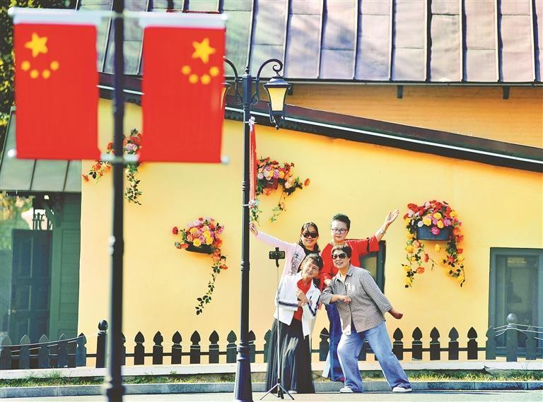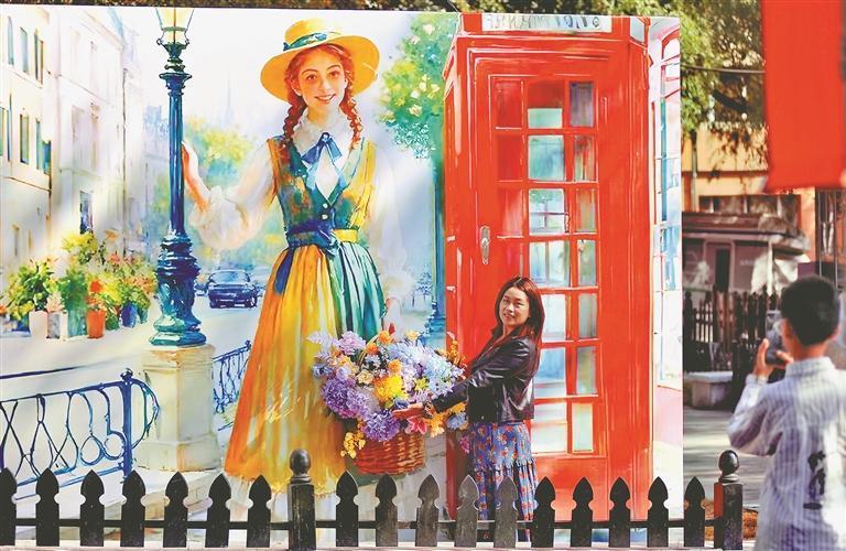 2日,哈尔滨市南岗区花园街历史文化街区,节日气氛浓厚,游客们纷纷在“黄房子”旁打卡拍照。