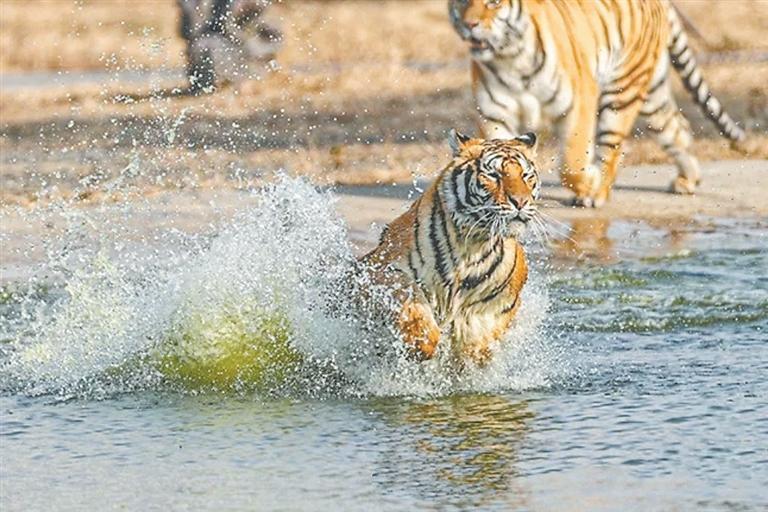 “快看!大老虎在游泳!”一辆观光车上,小朋友们兴奋地指着水池中正在打闹的东北虎。观光车司机兼讲解员笑着介绍:“东北虎‘大壮’特别喜欢展示它的游泳技巧,是咱们园里的明星虎。”