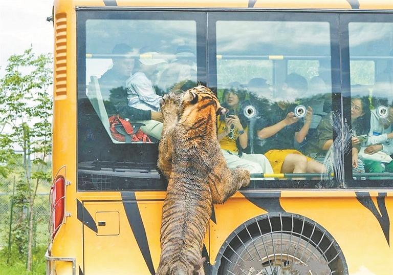 在惊险观光车上,游客可以通过特制装置给成年虎投喂食物,体验“虎口投食”的刺激。“从来没想过能这么近距离接触东北虎,看着它从我手中的夹子吃肉,既紧张又激动!”来自上海的大学生语气难掩兴奋。