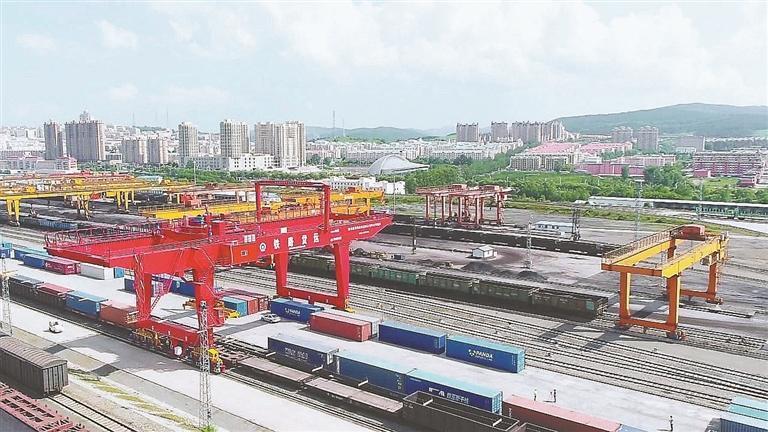 6日上午,百年口岸绥芬河铁路车站换装货场内,塔吊在高效有序地对进出境货运列车进行着换装作业。
