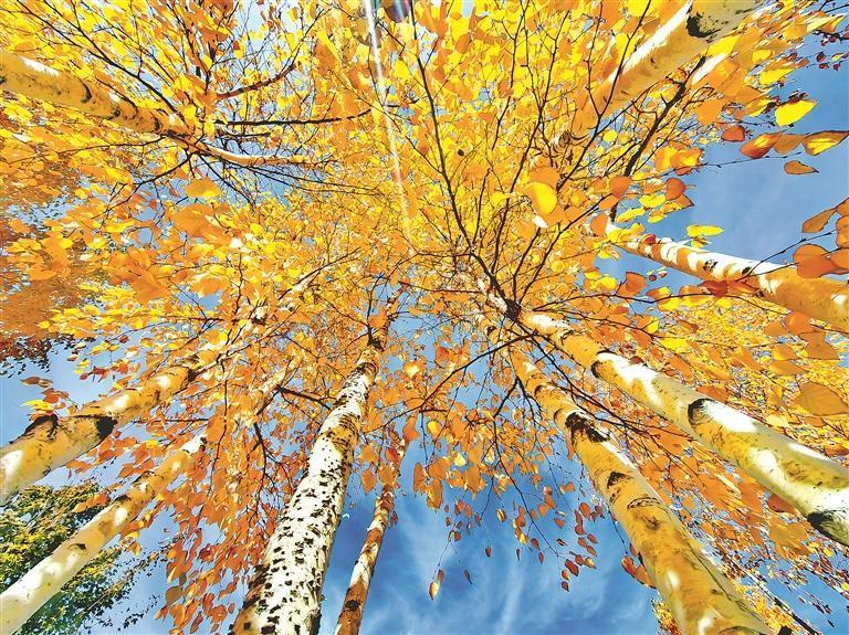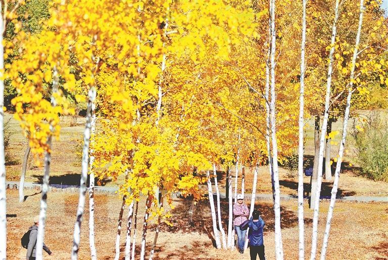12日,哈尔滨市道里区丽江路附近的松花江畔,一小片白桦林吸引人们驻足观赏、拍照。深秋的白桦树,树干笔直高耸,树皮洁白如纸。枝头的叶子已经由绿色变成了金黄色,在阳光的照耀下,色彩浓重,景色迷人。本报记者 苏强摄