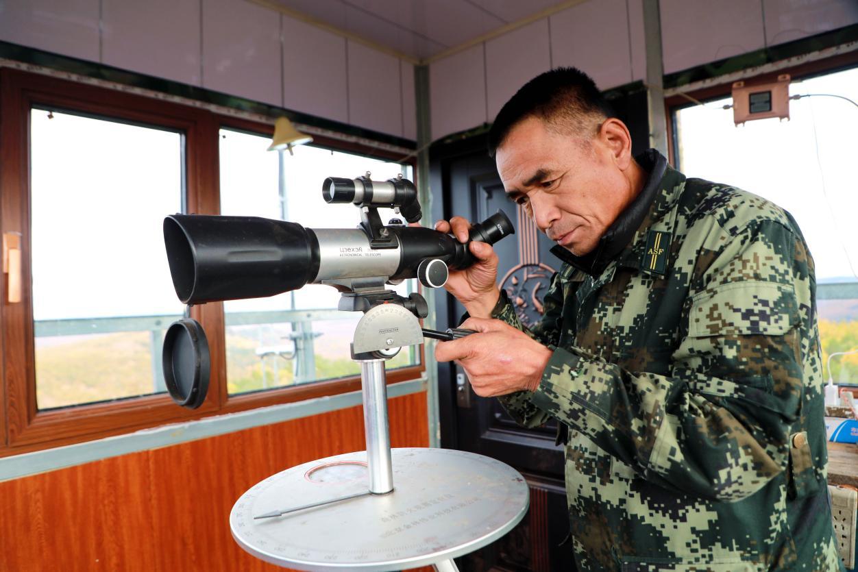 阿木尔林业局“阿03”塔瞭望员高森林在新建成的塔室内,密切关注周围森林情况(王力 摄)