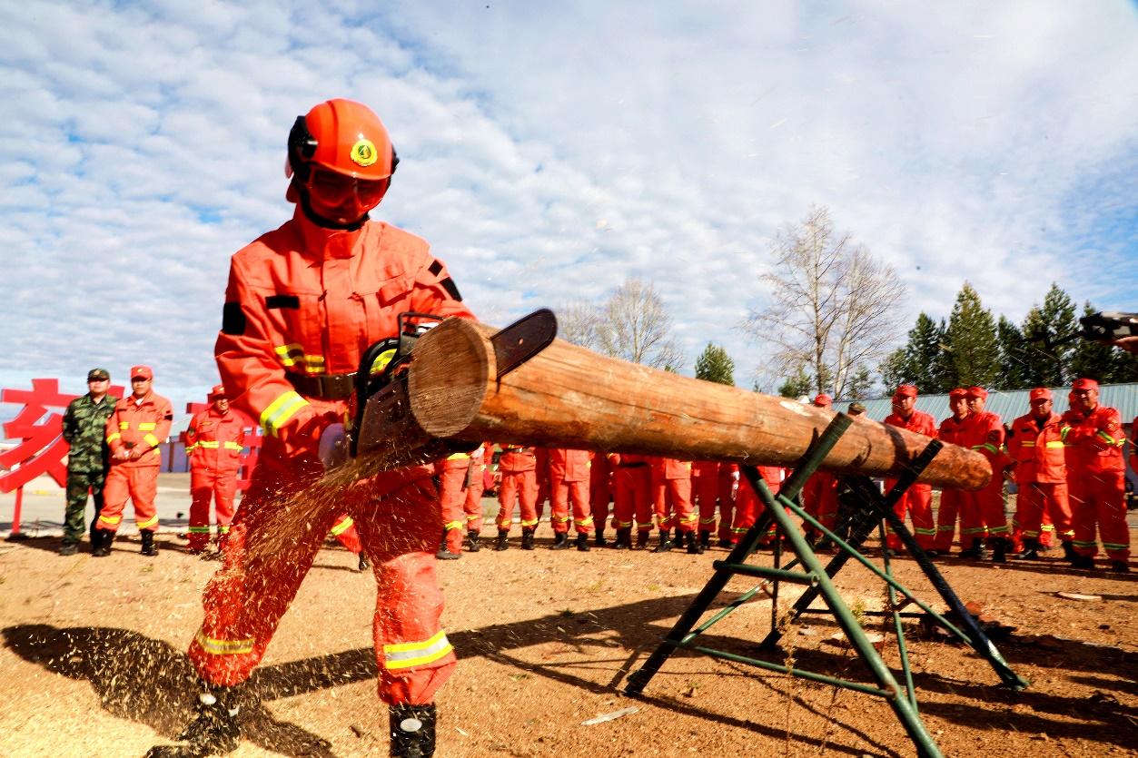 阿木尔林业局扑火专业队员在进行油锯割木竞赛(王力 摄)