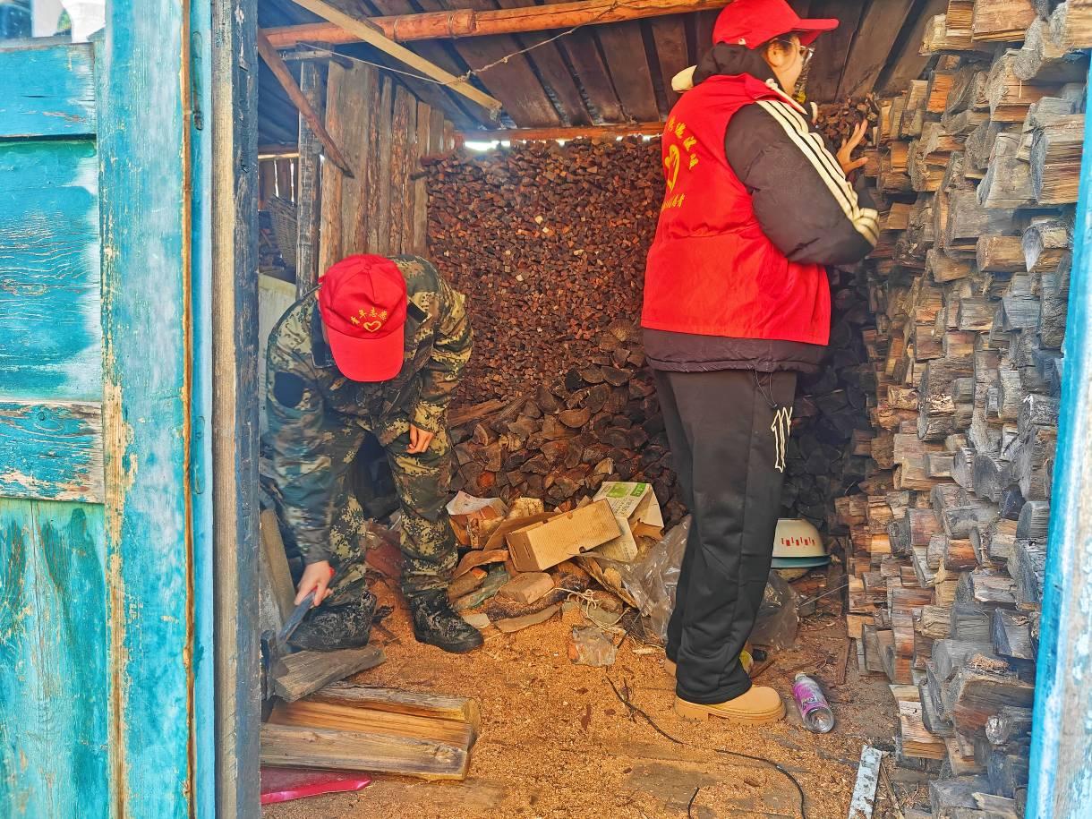 林场志愿者在帮助困难职工整理烧柴(朱旭 摄)