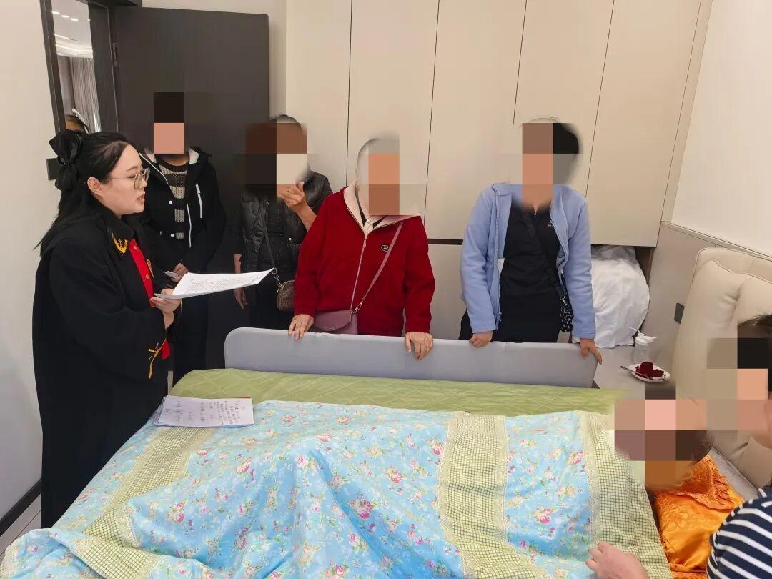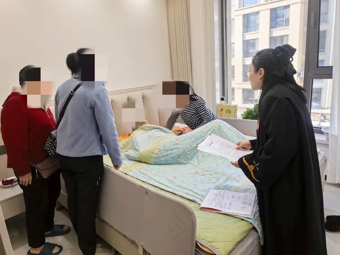 开庭当天,干警们一进老人家门,就忙着搭建“临时法庭”;法官没有用急促的问话推进流程,反而把语速放慢了两倍,拉着老人的手耐心倾听——这份“把当事人当家人”的细致,渐渐融化了老两口心中的芥蒂,让他们愿意敞开心扉沟通。调解结束后,法官特意蹲在张爷爷的病床边叮嘱:“后续的法律文书我们会直接送过来,您和阿姨要是有任何疑问,随时给我们打电话,不用来回跑法院。”听到这话,张爷爷看着干警们收拾东西的背影,浑浊的眼睛里忽然泛起了微光,他轻轻吐出两个字:“谢谢”。这简单的两个字,藏着老人及家人对“司法不缺位”的深深感激,更映出了人民群众对“司法为民”的热切期盼。