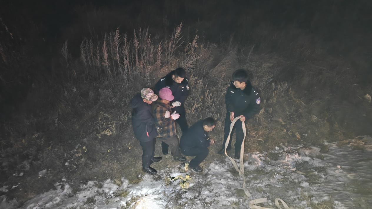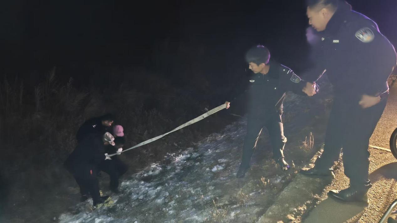 据了解,当时呼玛县公安局兴华派出所民辅警正对辖区开展常态化巡查,发现一位群众在路边拦住警车,民辅警立即停车查看情况。询问得知,该群众的妻子乘坐电动轮椅时由于天黑路滑不慎驶进了深沟,因其妻子年过六旬身体残疾且行动不便,坠入深沟摔倒后无法起身,恰好此时看到巡逻的警车,便立刻拦车寻求帮助。