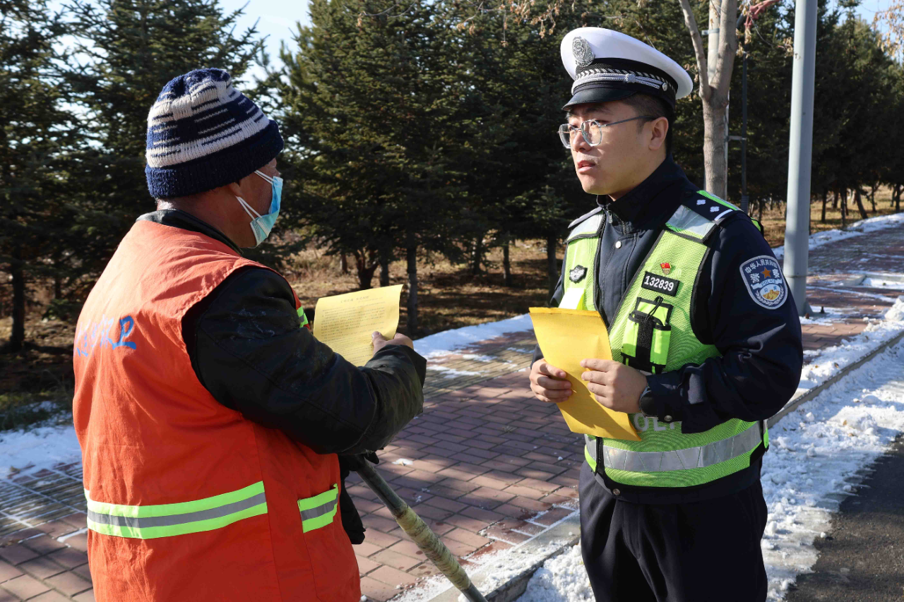活动中,宣传民警结合冬季低温、雨雪、低能见度的气候特点及环卫作业规律,精准开展安全宣教。通过组织观看交通事故案例及安全警示视频,向环卫工人详细直观地剖析事故成因,警醒环卫工作人员务必在确保自身安全的情况下开展道路作业,切实敲响安全“警示钟”,拧紧交通“安全阀”。