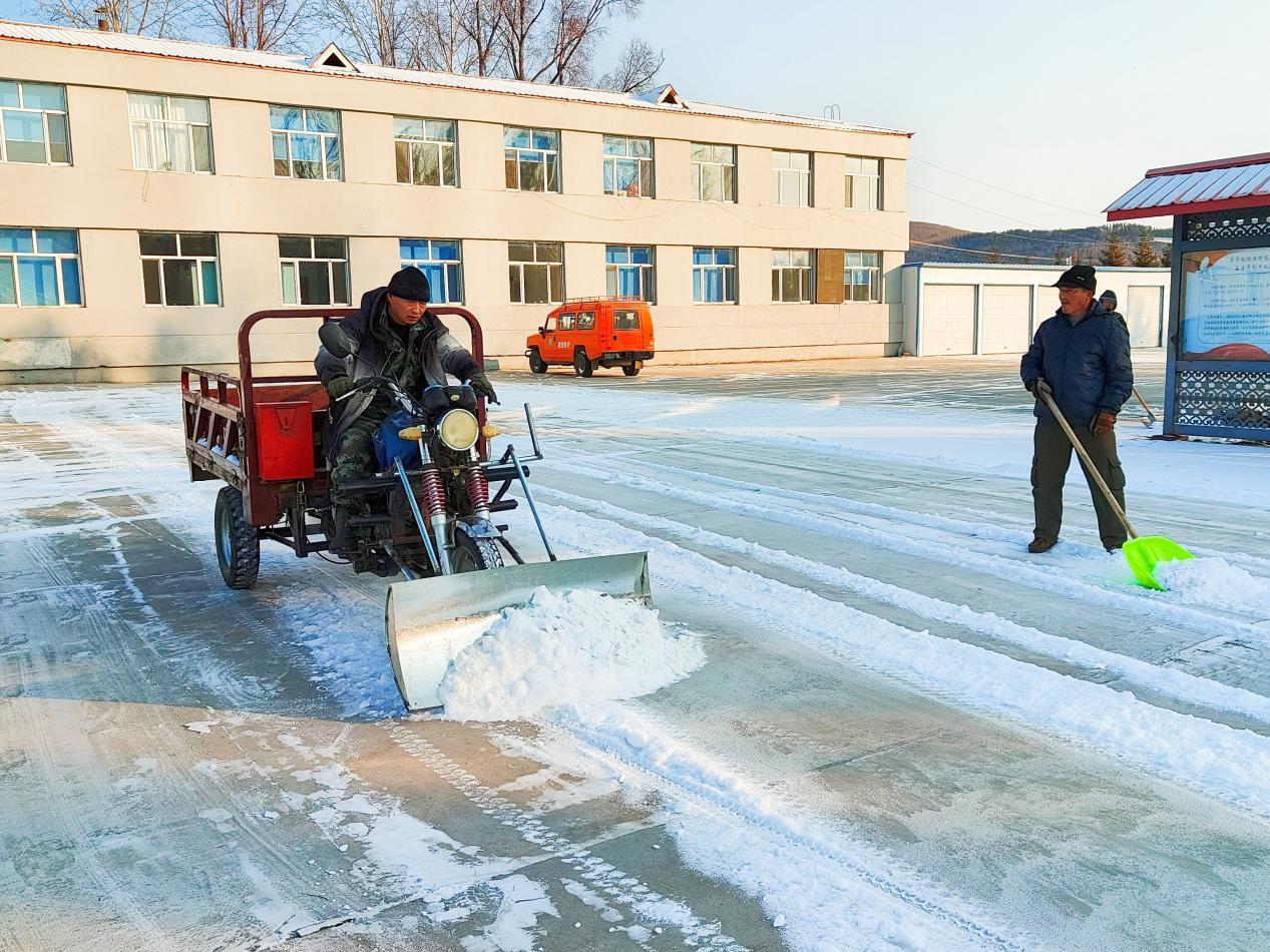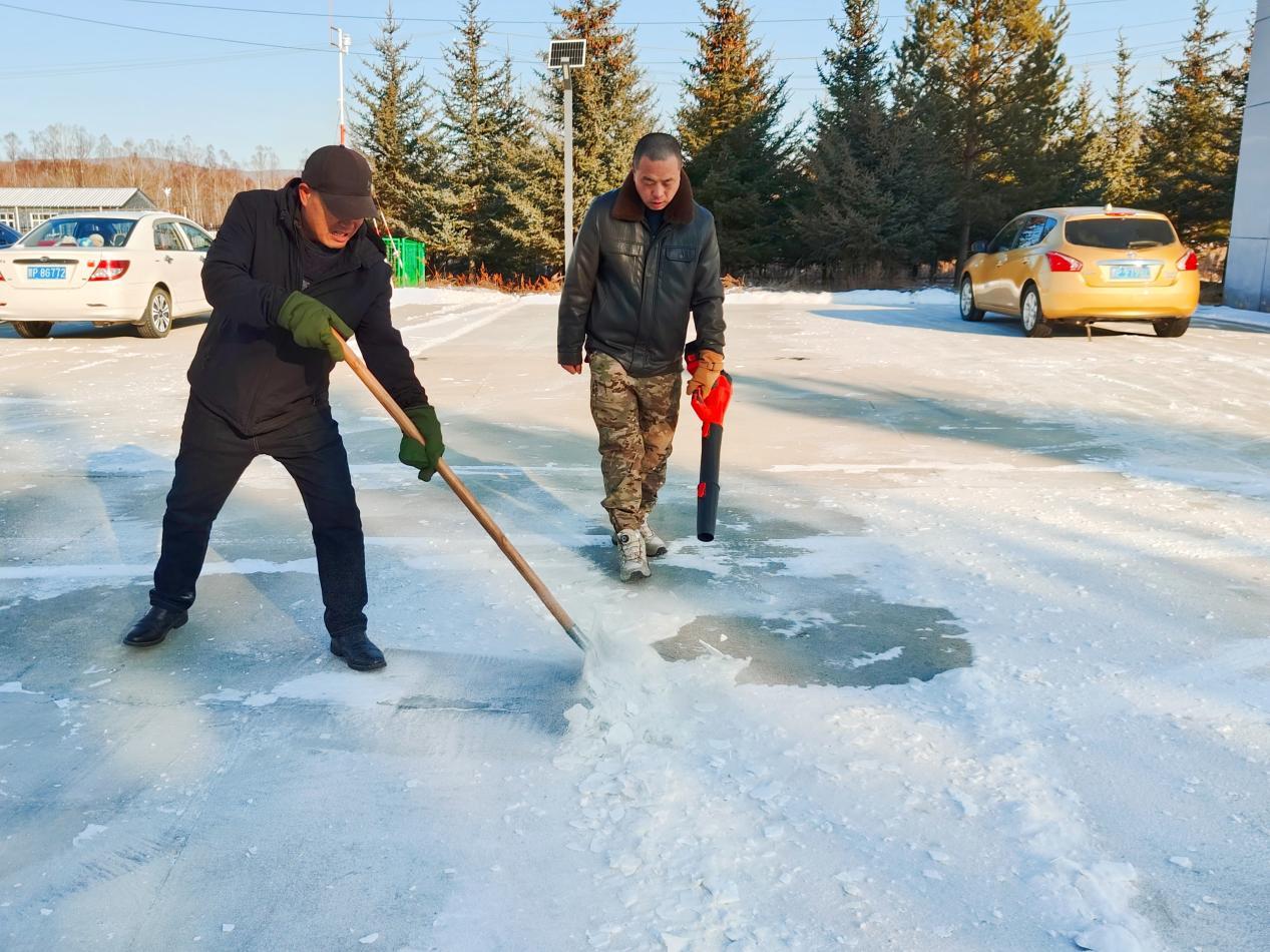 清雪现场,干部职工们严格遵循“即下即清、雪停路净”的原则,不畏凛冽寒风,迅速投入战斗。大家分工协作,形成了“机械+人工”的高效清雪模式。职工们各展所长,有人驾驶自制清雪车清理积雪,有人用推雪板归集散雪,还有人手持雪铲、吹雪机细致清理人行道缝隙等边角区域。经过近3小时的奋战,林场责任区内的积雪被清除干净,露出了整洁的路面和畅通的通道,为职工群众和过往车辆安全通行清出了一片“平安路”。