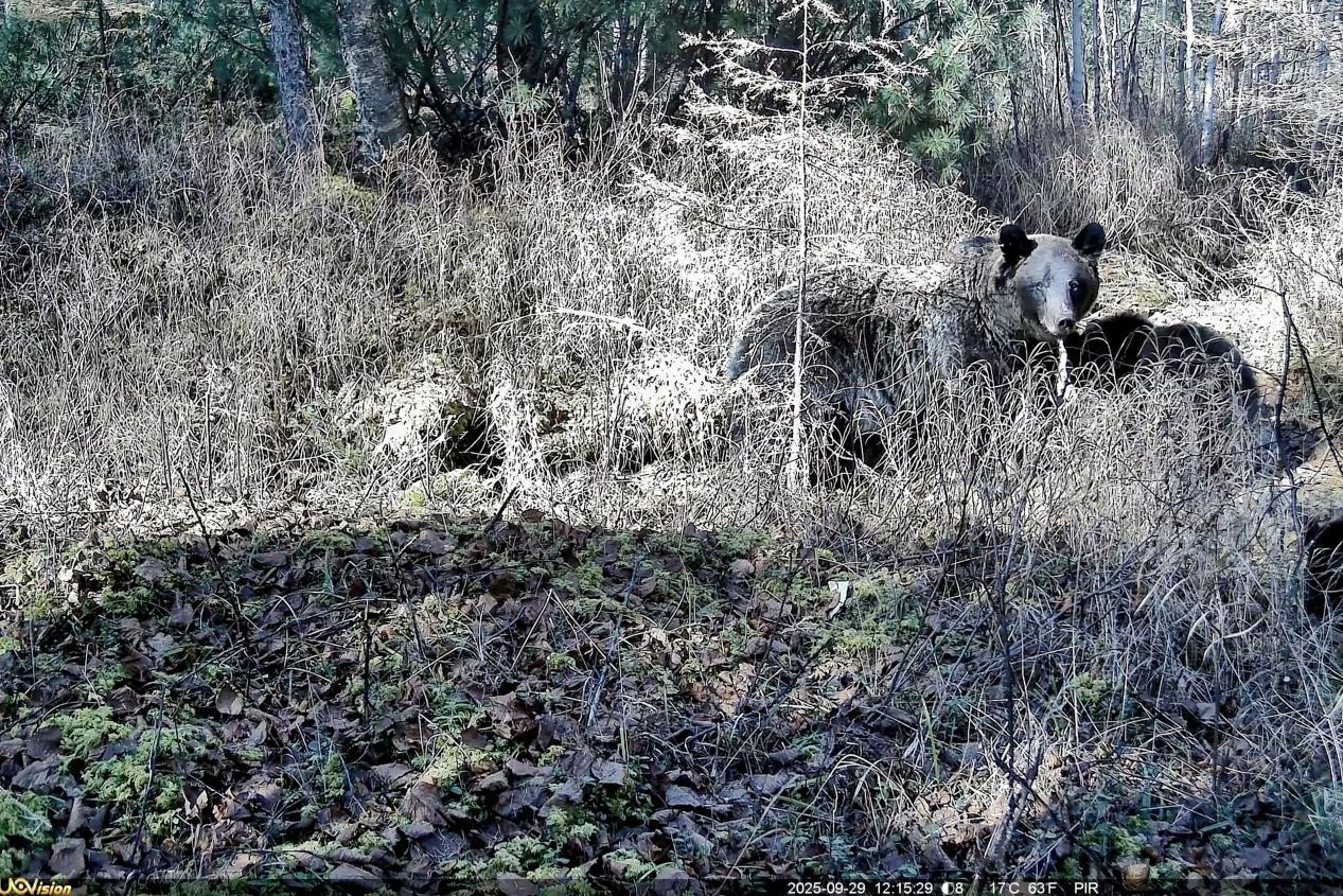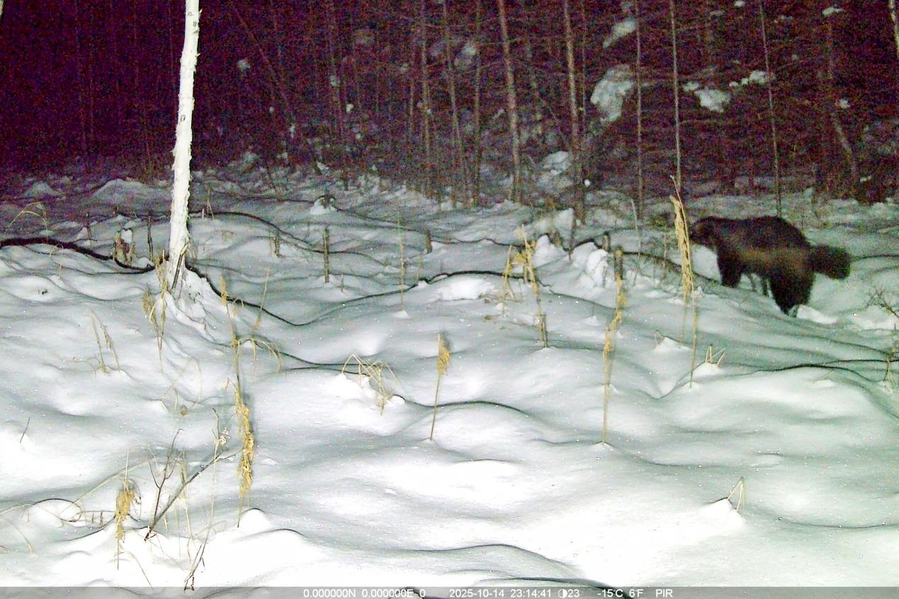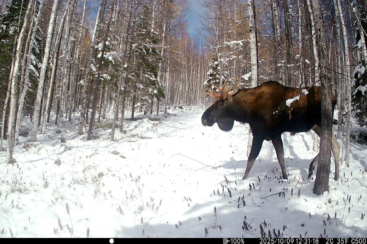项目实施中,工作人员克服地形复杂、严寒天气等挑战,深入森林公园腹地完成15条冬季样线调查,并同步开展97台红外相机的维护与回收工作,累计获取了大量珍贵野生动物影像资料及活动数据。监测范围内,驼鹿、原麝、貂熊、紫貂、猞猁、棕熊、马鹿、花尾榛鸡等国家重点保护野生动物相继现身,更捕捉到原麝觅食、棕熊带崽等罕见画面,直观印证了森林公园内栖息地质量优良、生态保护成效显著。