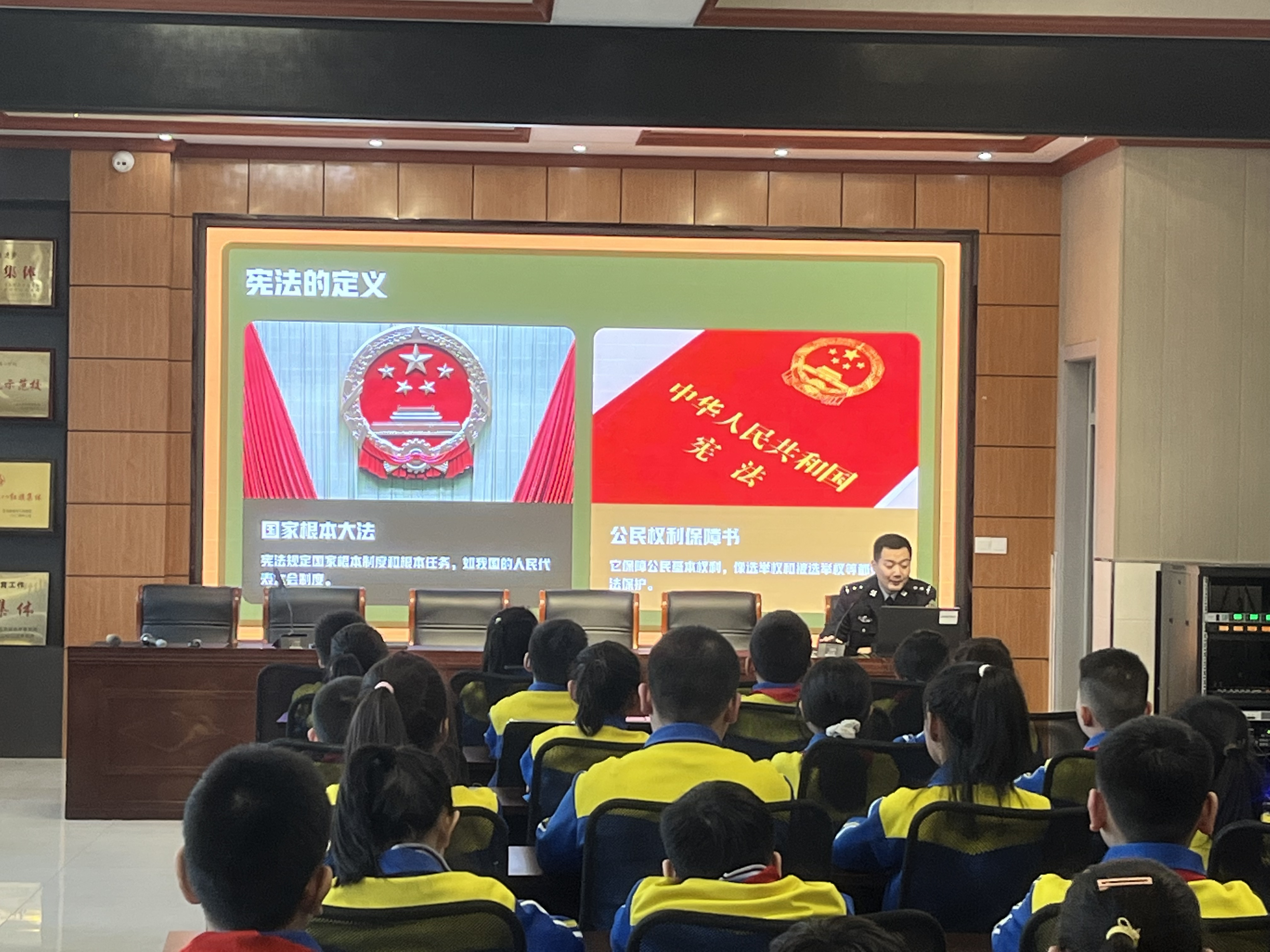 讲座中,民警以通俗生动的语言,围绕三大核心内容展开宣讲:一是宪法基础认知,重点阐释宪法作为国家根本大法的地位与作用,结合受教育权、人身安全保障、遵守校园规则等小学生熟悉的生活场景,让学生真切感受到宪法并非“遥远的法律”,而是与自身息息相关的行为准则;二是权利与义务对应,明确小学生依法享有的受教育权、人格尊严不受侵犯等合法权利,同时详细讲解遵守宪法法律、尊敬师长、维护公共秩序等必须履行的义务,引导学生树立“权利有边界,义务须履行”的法治观念;三是校园法治安全,针对校园欺凌、交通安全、网络安全、防范陌生人侵害等问题,民警结合宪法及相关法律对未成年人的保护规定,传授简单实用的自我保护方法和求助途径,着重强调遇到危险时可及时拨打110报警电话或告知老师、家长。