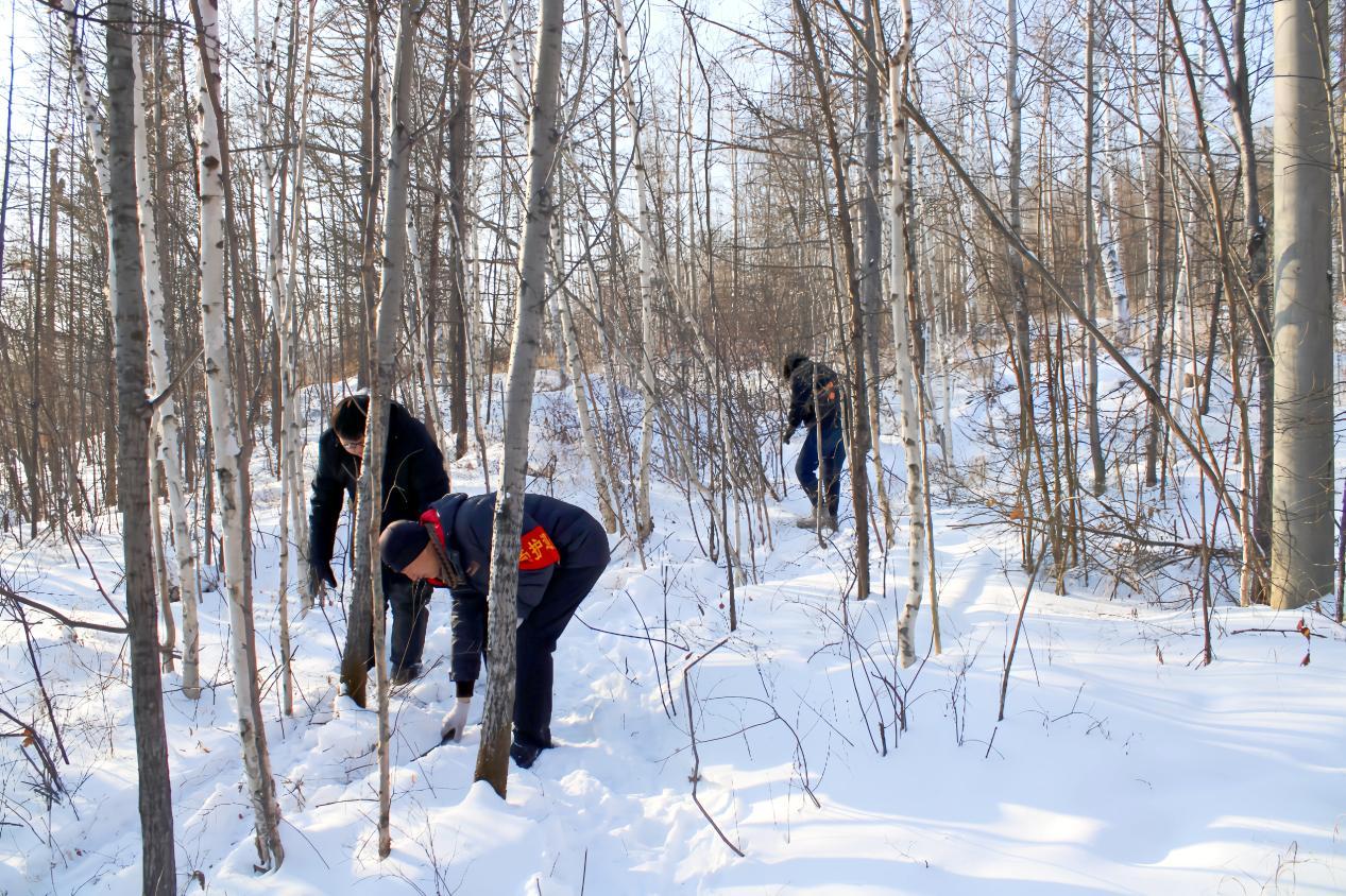 林场工作人员正在仔细排查可能隐藏在草丛、树下、石缝中的猎夹、猎套(赵可心 摄)