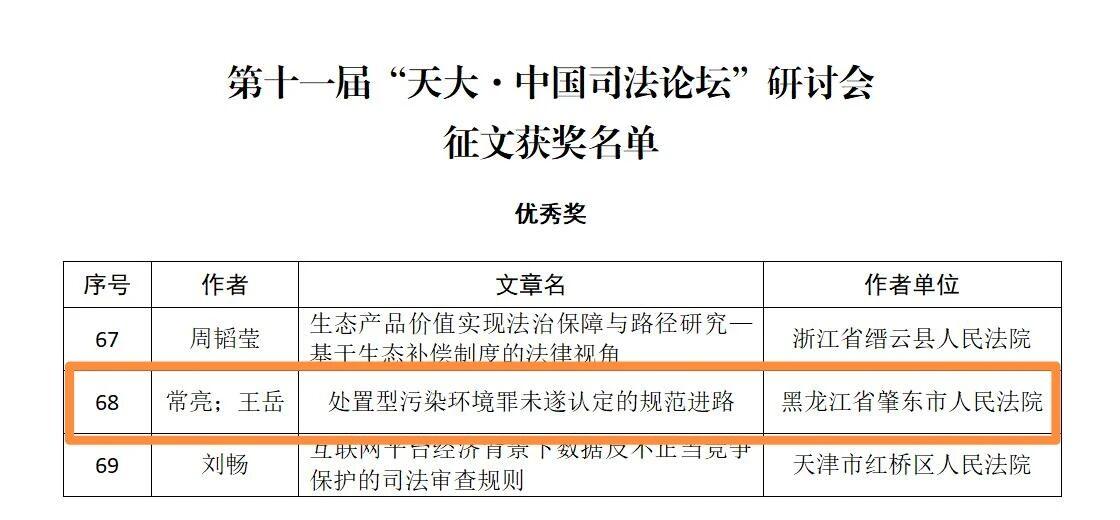 黑龙江经济网讯(董慧莹 李雪松)近日,由中国行为法学会司法专业委员会主办、天津大学承办的第十一届“天大·中国司法论坛”研讨会征文获奖名单公布。本次征文活动共收到投稿论文620篇,经评委会严格评审,共选出一等奖8个、二等奖24个、三等奖48个、优秀奖102个。其中,肇东市人民法院审管办副主任常亮、审管办书记员王岳撰写的学术论文《处置型污染环境罪未遂认定的规范进路》荣获优秀奖。