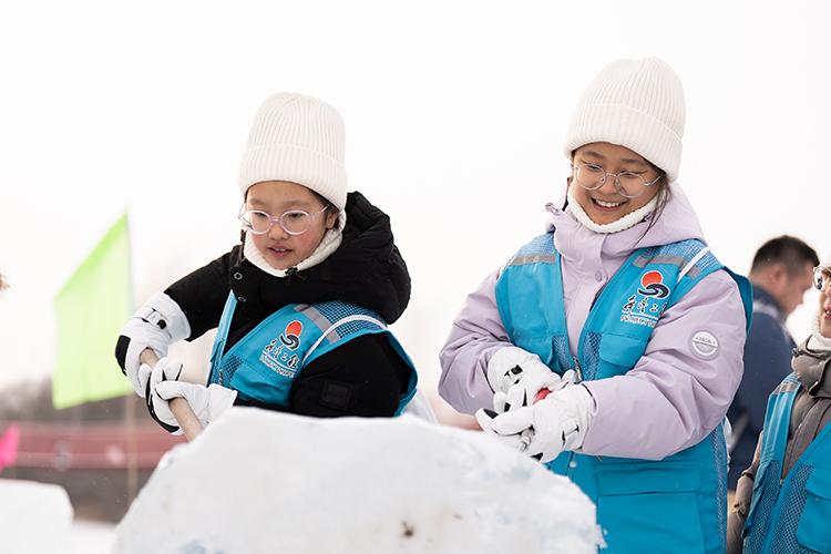 研学少年们走进小朱家村的人文与自然世界。小朱家村三面环水、毗邻镜泊湖的独特地理位置,让大家读懂了这座村庄与冰雪的深厚渊源,而“村集体+企业+农户”的发展模式,更让孩子们了解到“中国冰村”从冬闲小村蜕变为文旅热土的蝶变历程。在冰封江畔,孩子们俯身细察冰层下纵横交错的裂缝与晶莹剔透的气泡,沉浸式感受冰雪的肌理;走进冰屋、观赏冰人与冰挂景观,仿佛踏入如梦似幻的冰雪童话世界;在专业老师的悉心指导下,研学少年们亲手体验冰雕创作,雕刻苹果、桃子等水果冰雕,孩子们通过亲身体验,真切领略到冰雪艺术的独特魅力,自然与人文的双重滋养也在少年们的心中悄然扎根。