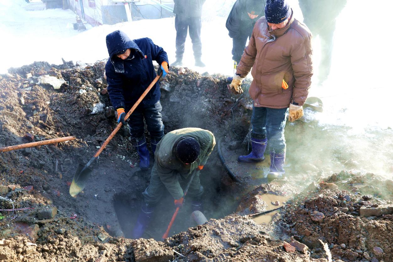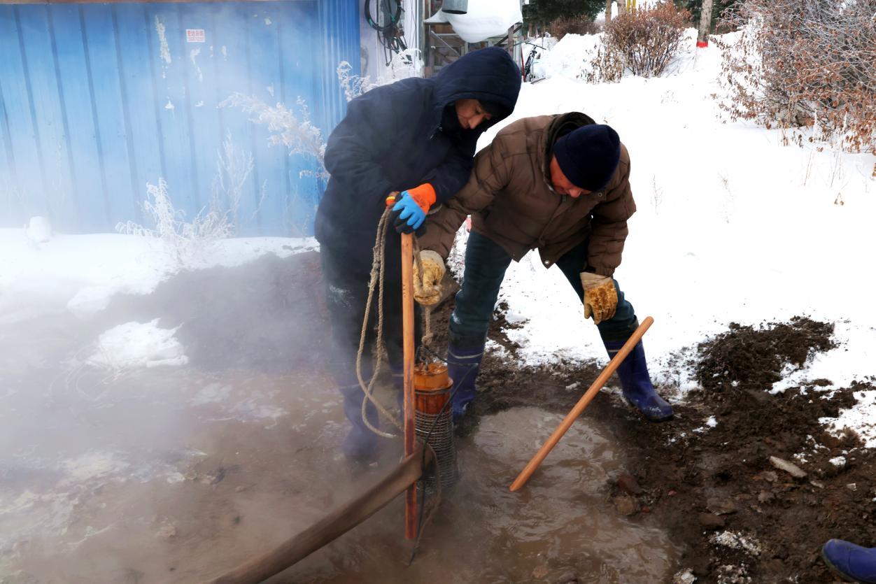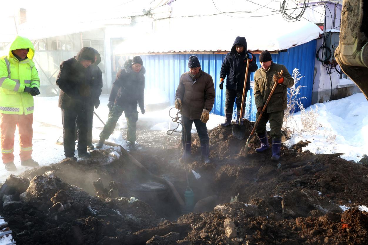当日早8时许,物业公司巡线员巡查时发现西华路平房区地面冒热水,立即上报并启动抢修预案。7名抢修人员火速赶赴现场,现场分工明确、紧张有序,有的安装水泵排水,有的接驳应急电源,有的挥镐刨挖冻土层,同时调配小型挖沟机辅助作业。