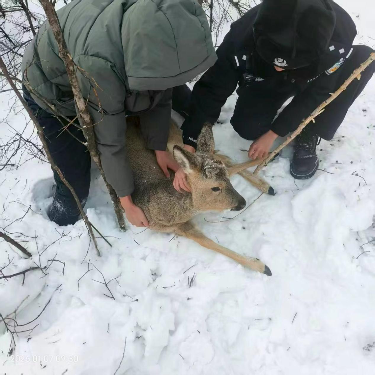 联合巡护小组深入县域重点野外区域,对野生动物频繁活动的林区及重点生态功能区进行排查。其间,小组发现一只疑似受伤的狍子,经检查确认其体表无明显外伤、精神状态良好。工作人员对其进行短暂观察后撤离,让狍子重返野外栖息地。