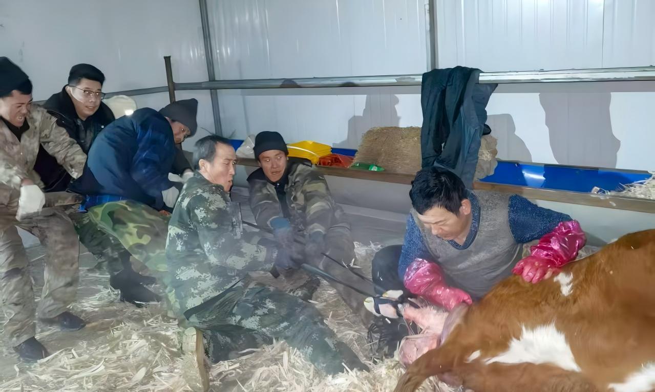 赶到牛棚时,发现一头棕白花母牛卧在干草堆上,四肢抽搐,腹部剧烈起伏却始终无法完成生产。 “别急,我们现在应该利用助产工具,现在必须立刻进行人工助产拖拽!” 民警一边安抚养殖户的情绪,一边分工协作。两个小时后,随着母牛一声响亮的低吼,在众人的合力帮助下 ,小牛犊成功降生。