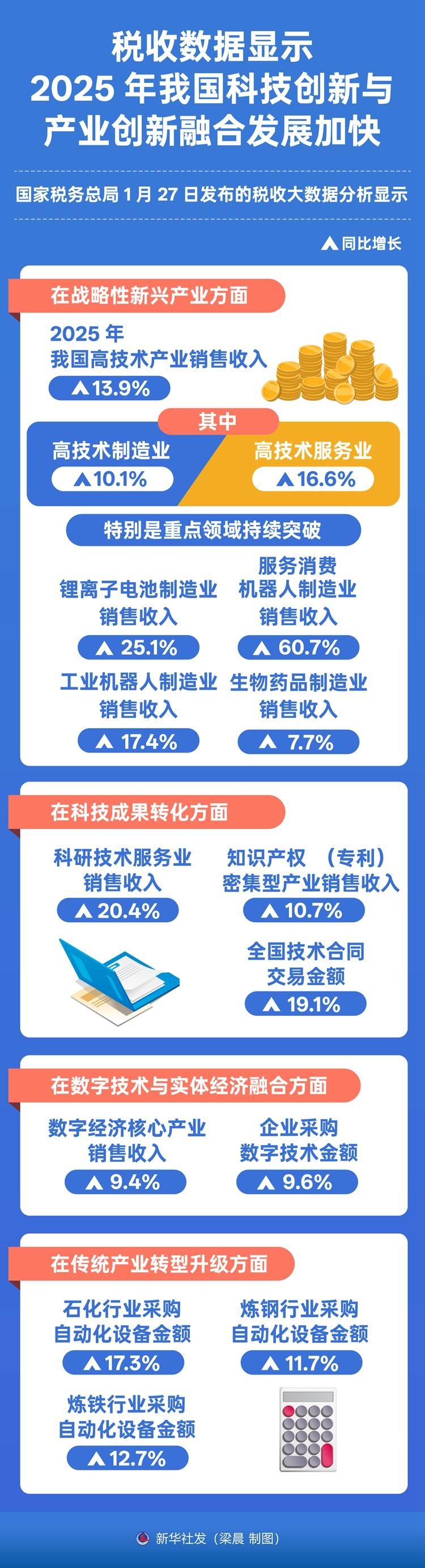 新华社北京1月27日电(记者刘开雄)国家税务总局1月27日发布的税收大数据分析显示,2025年,我国科技创新与产业创新融合发展加快,战略性新兴产业茁壮成长,科技成果转化力度持续提升,数字技术与实体经济融合加深,传统产业转型升级加快。